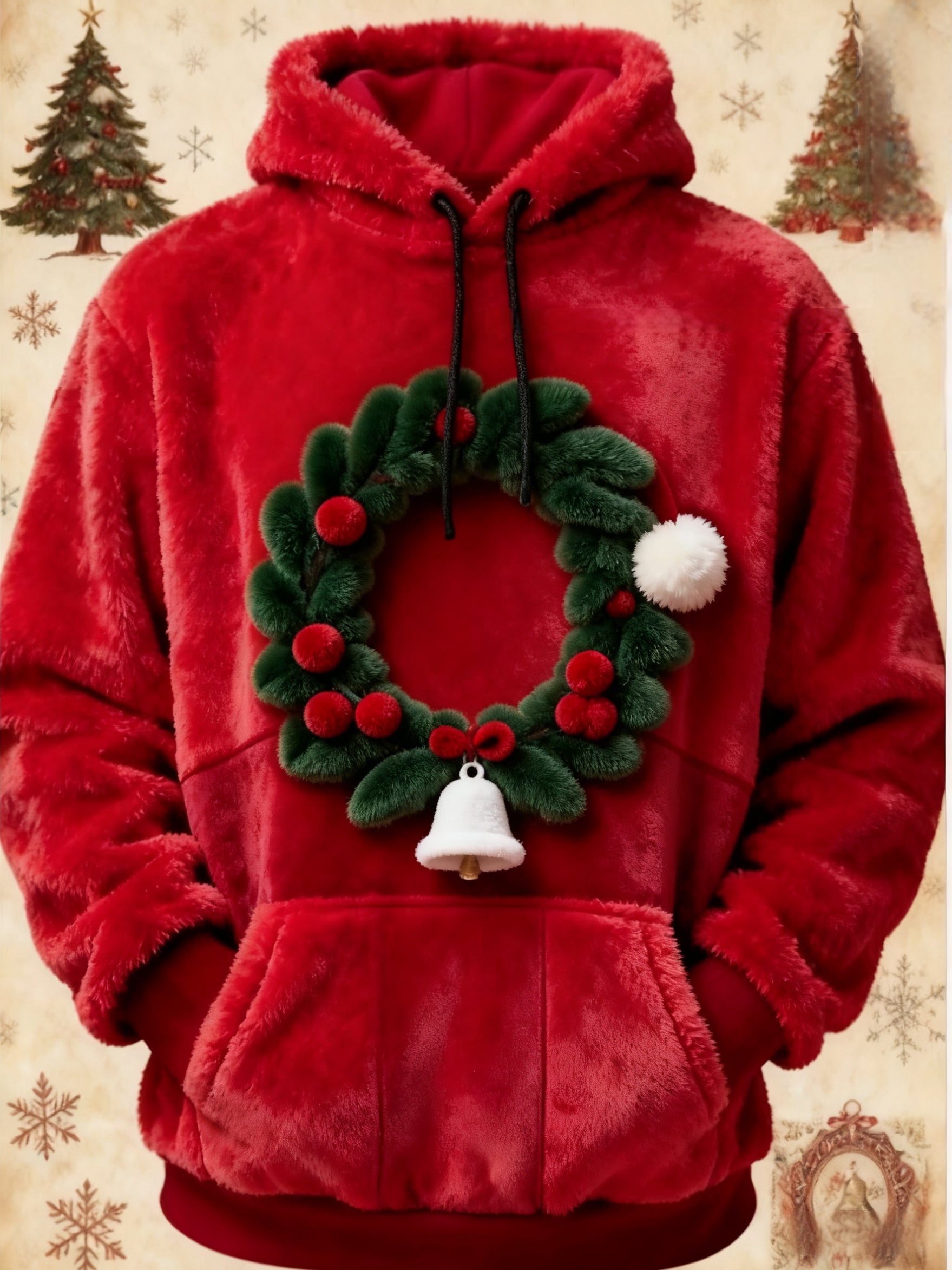 Retro Christmas Wreath Print Fleece Pocket Hooded Sweatshirt