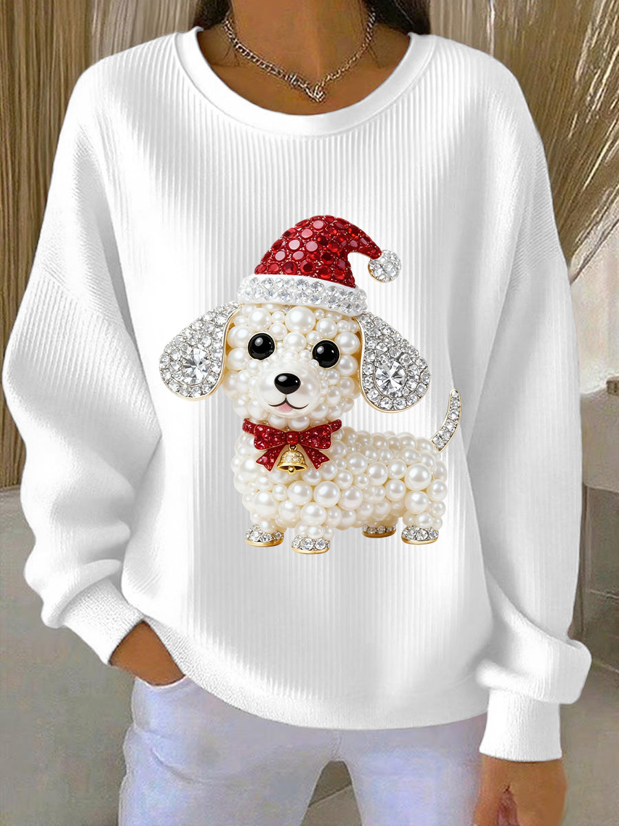 Women's Christmas Dog Art Ribbed Round-Neck Sweatshirt