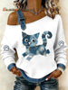 Women's Denim Cat Printed Single Shoulder Sweatshirt