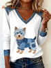 Women's Denim Patchwork Art Yorkshire Terrier Dog Pattern V-neck Long Sleeve T-Shirt