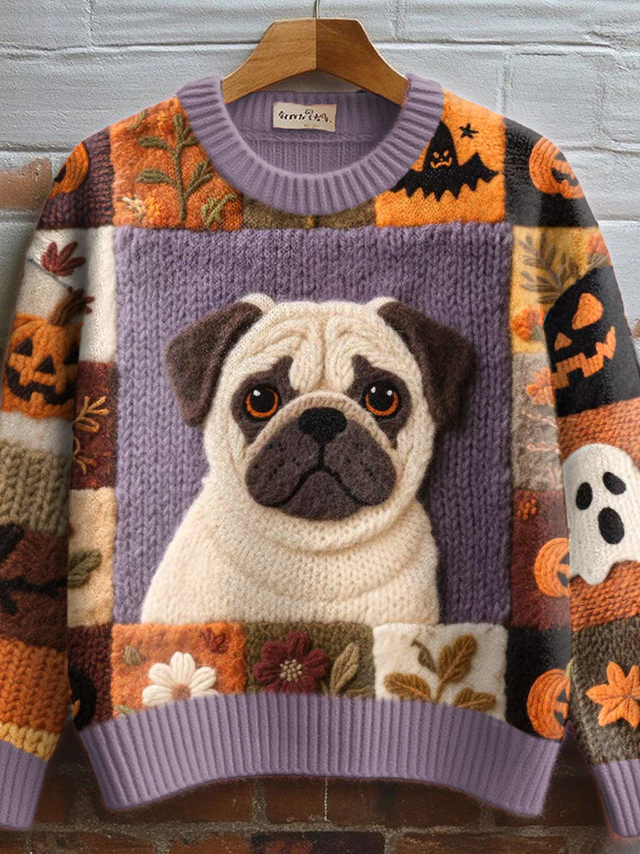 Women's Fall Inspired Pug Felt Art Cozy Knit Sweater