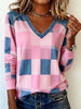 Women's Fashion Plaid Pattern Patchwork Art V-Neck Top