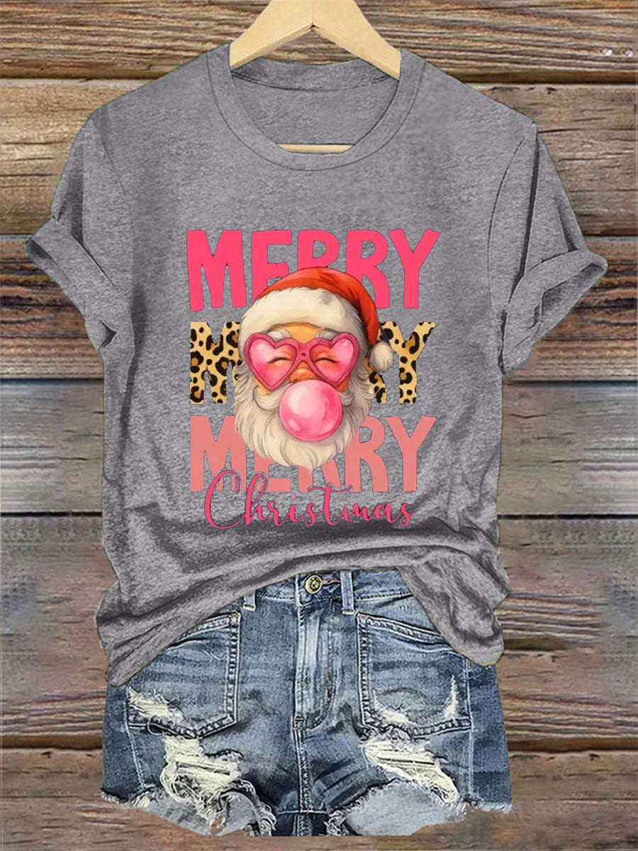 Women's Merry Christmas Santa Claus Print Casual Tee
