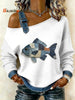 Women's Vintage Fish Patchwork Print Casual Off-Shoulder Sweatshirt