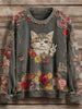 Women's Vintage Patchwork Flower Cat Art Print Sweatshirt
