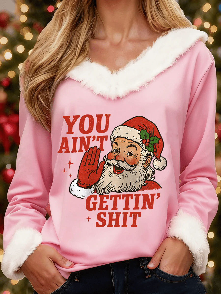 Women's You Ain't Gettin' Shit Santa Claus Print Faux Fur Collar Sweatshirt